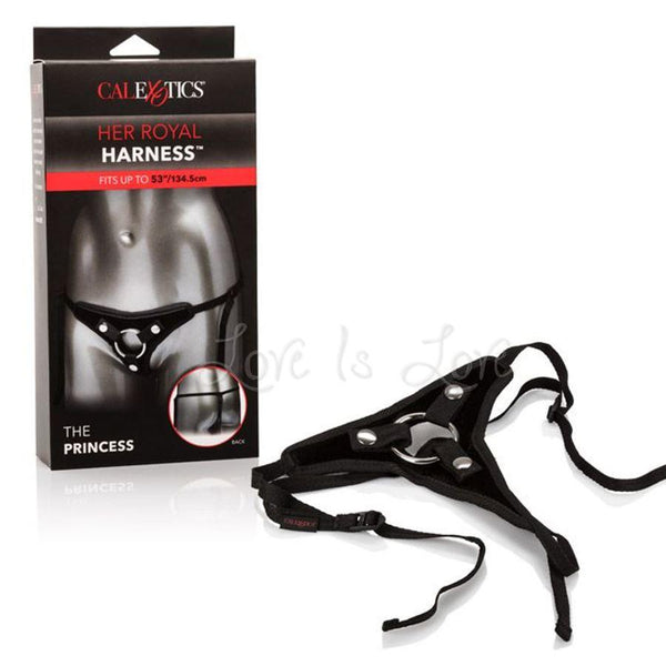 Prepare yourself for thrilling pleasure and premium probe play truly fit for royalty with The Princess. Her Royal Harness' luxurious dildo harness from CalExotics is made for comfort and performance with an adjustable T-Back design, sturdy O-ring and soft double-padded lining. The soft, feminine design appeals to even the most dominant with an accommodating probe O-ring and easy-to-use snaps to let you quickly change probes and securely hold them in place. Surrender yourself to your most erotic fantasies and dive deep into carnal pleasure whenever you slip into this fashion-forward harness. The fully adjustable waist fits up to a 53” Waist (134.5 cm) and the interchangeable O-ring accommodates most strap on dildos with a diameter of 1.75” (4.5 cm).