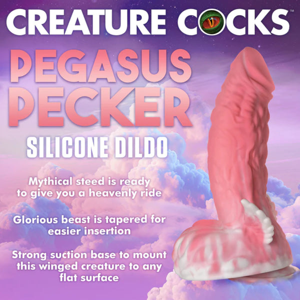 Let your fantasies take flight as you ride the Creature Cocks Pegasus Pecker Winged Silicone Dildo! This girthy, thick dong is pink and white with lots of grooves, bumps, and tuft-like shapes that imitate fur and feather. Two wings adorn the base on either side of the tufted balls. The tip is phallic and round for easier insertion. Made out of premium, flexible, phthalate-free silicone, this dong is body-safe and best used with water-based lubricants only.