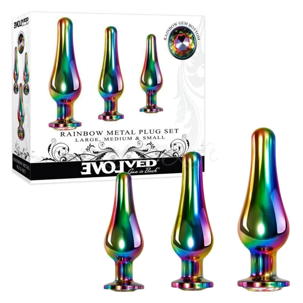 Experience the exquisite pleasure of back door play with this rainbow-colored metal anal plug set from Evolved, that features three different sizes to boost your orgasmic potential.