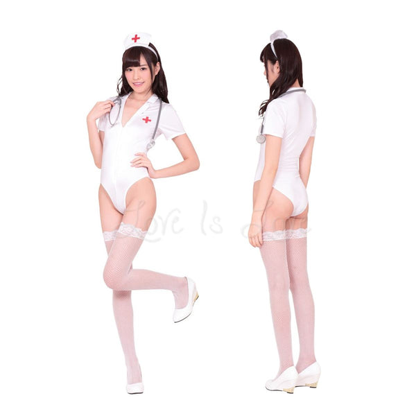 The nurse costume consists of a sexy, form-fitting leotard that is easy to put on and take off with its front zipper that zips down to the waist. The outfit is completed with an adorable nurse hat headpiece with red cross print.