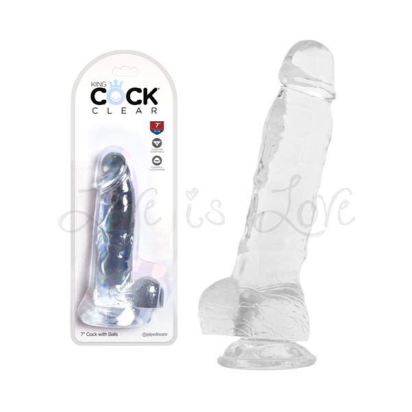 King Cock Clear Cock with Balls 7 Inch or 7.5 Inch combines a translucent dildo with a realistic cock design. The luminous clarity and lifelike form will fulfill all your fantasies! With its flexible shaft, detailed veins, and defined head and balls, King Cock Clear will engage your senses visually and physically.