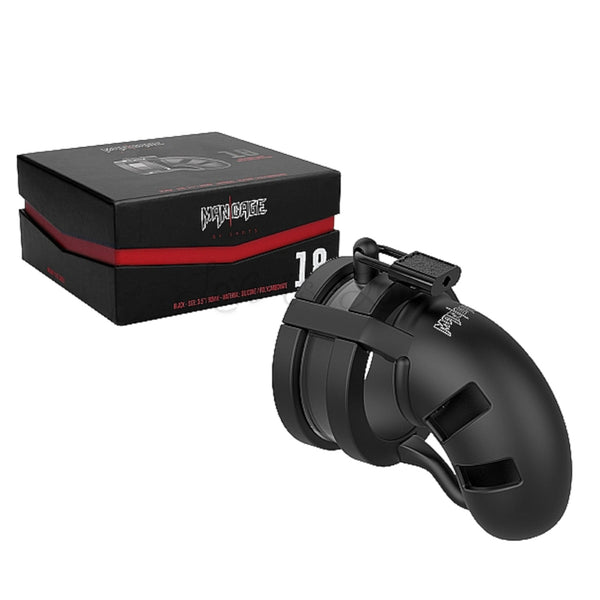 This Shots Mancage Chastity Silicone Cage With Ball Splitter Model 18 Black is an absolute must for people who love kinky BDSM! With this Mancage you prevent an erection by 'cageing' your penis - which builds up to an extreme release when it is removed.This Mancage is made of medical grade silicone and is available in two sizes. There are several adjustable rings added that secure your penis and balls with a strip. This Mancage offers the extra pleasure of a splitting ballstrap, which is placed tightly between the balls and is connected to the ring and the cage. Which is also made of a comfortable silicone. Due to the medical grade silicone it is safe to wear all day long, and it fits smoothly under clothing. This way you can wear it secretly, but with ease, everywhere. It has functional openings for ventilation and toileting and is easy to clean.