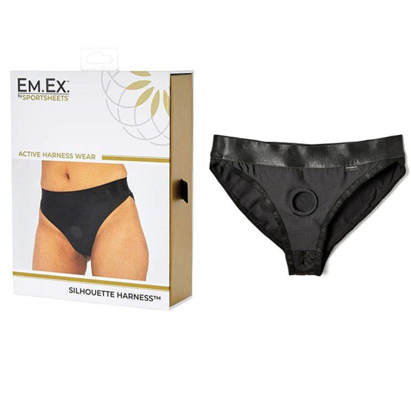 The Sportsheets Em.Ex. Active Harness Wear Silhouette Harness Black in Small or Medium is a comfortable high-cut harness, with 2 bullet vibe slots for extra sensation. Perfect for long-term wear, its wicking material controls moisture. Silhouette’s fabric is soft, while the elastic waistband is durable. Interior fabric panels offer even more support.