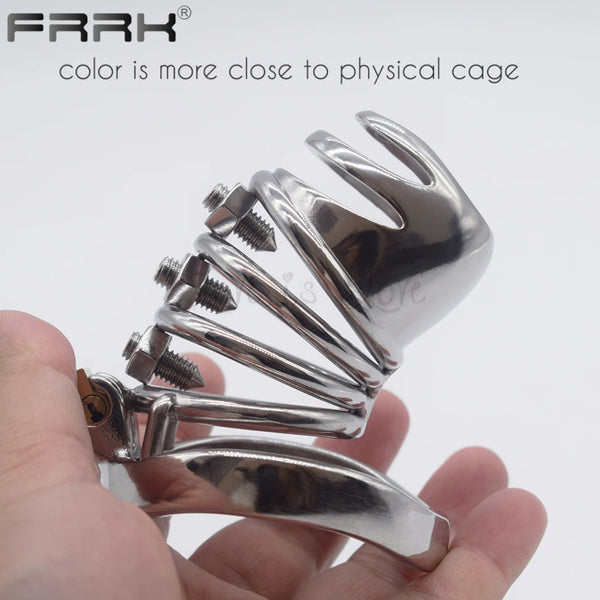 Show your submissiveness with this Stainless Steel Curve Spike Screw Chastity Silver Cock Cage #103A with 45 mm Curved Ring!