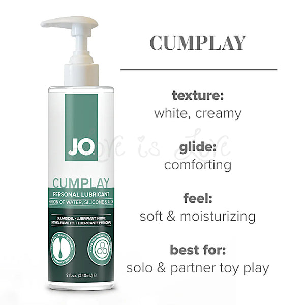 JO Cumplay is a specialty formula designed to mimic the natural look and feel of semen. This creamy, white fusion of water, silicone and aloe provides a slick, comforting glide for any type of play, is never greasy or oily, and dries to a silky soft finish.