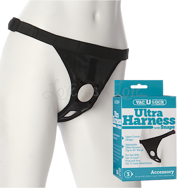 This Harness can be used by women or men. The opening under the plug is high enough to allow the man's penis to hang below. Just add your favorite Doc Johnson Vac-U-Lock attachment and you're ready to go! Available with snaps.