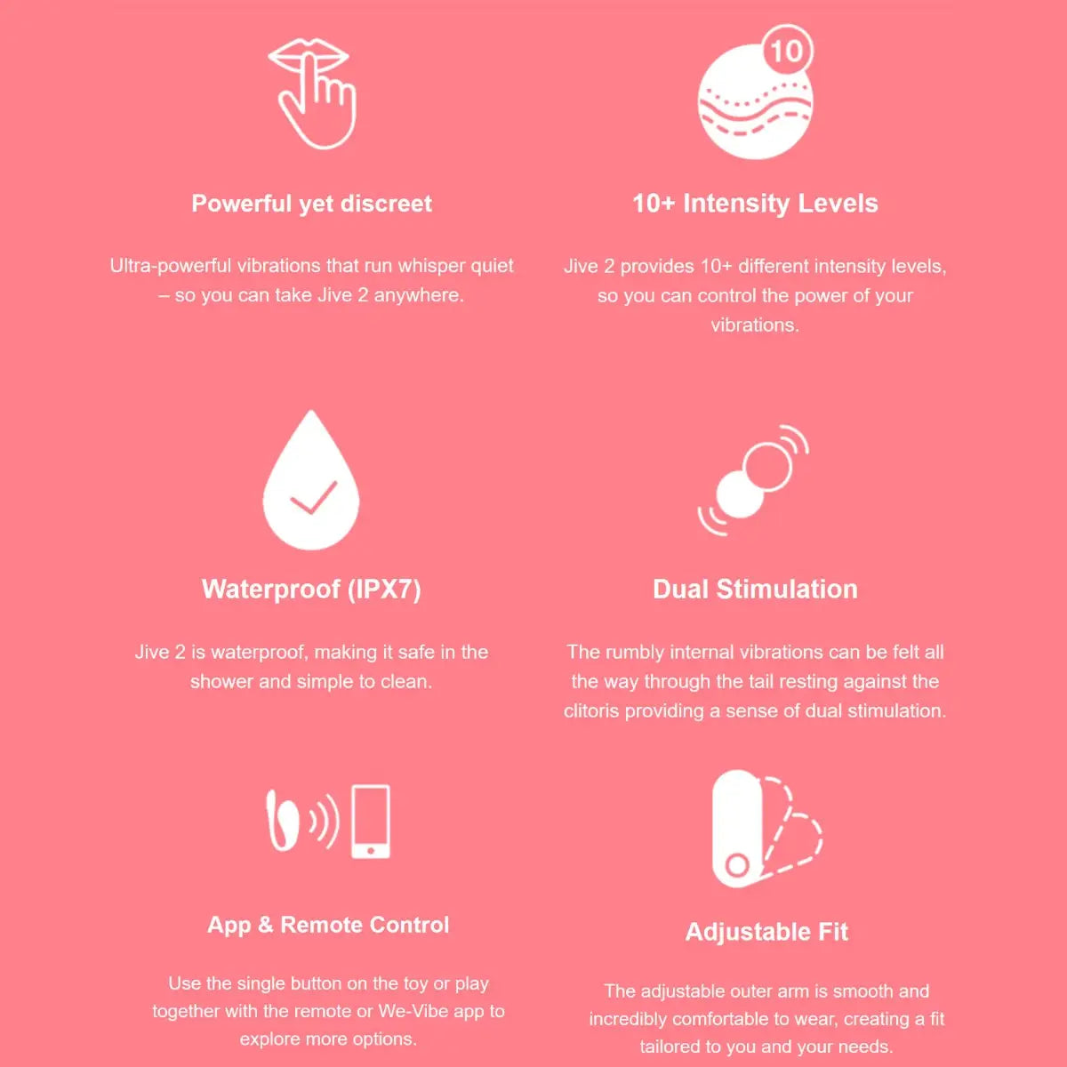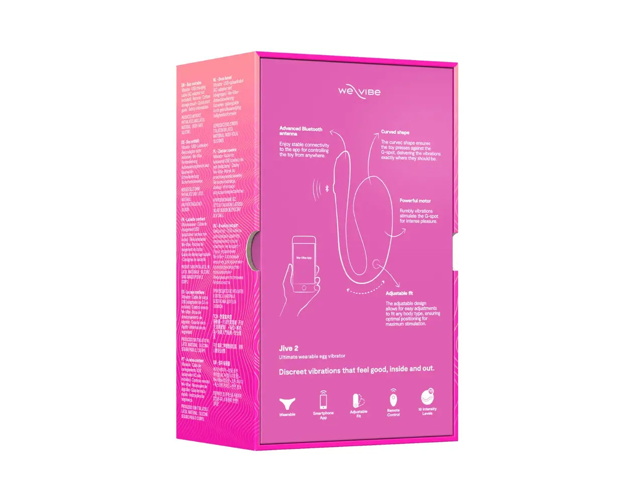 {"id":9407611207996,"title":"We-Vibe Jive 2 Remote and App-Control Egg Vibrator","handle":"we-vibe-jive-2-remote-and-app-control-egg-vibrator","description":"\u003cp\u003e\u003cstrong\u003eWe-Vibe Jive 2 - Egg vibrator with remote and App control\u003c\/strong\u003e\u003cbr\u003eJive 2 is the ultimate wearable egg vibrator, delivering powerful yet discreet vibrations to your G-spot. Whether at home or in public, hand over control to your partner with the remote or We-Vibe app for thrilling excitement and sensual exploration, wherever you are.\u003c\/p\u003e\n\u003cp\u003e\u003cstrong\u003eExplore a new dimension of pleasure with Jive 2, We-Vibe's upgraded wearable G-spot vibrator.\u003c\/strong\u003e\u003cbr\u003eThis sleek, powerful toy takes solo and partner play to new heights, delivering discreet yet intense vibrations directly to the G-spot. \u003cbr\u003eWith an adjustable tail for added clitoral stimulation, Jive 2 invites you to surrender control and elevate your intimacy, whether in the same room or across distances, using the free We-Vibe remote or the We-Vibe app.\u003c\/p\u003e\n\u003cp\u003eExperience ultra-powerful yet whisper quiet vibrations, allowing for intense pleasure anywhere, anytime and double the pleasure with Jive 2's rumbly vibrations, designed to stimulate not just the G-spot, but also your clitoris for a sensation of heightened pleasure.\u003cbr\u003eTailored for pure pleasure, Jive 2 features an ergonomic shape and an adjustable tail that easily adjusts to your unique body, ensuring satisfying stimulation with maximum comfort and pleasure during use and easily control Jive 2 with a single button on the toy or play together with the remote or We-Vibe app, exploring a variety of options for enhanced pleasure.\u003c\/p\u003e\n\u003cp\u003e\u003cstrong\u003eProduct Features:\u003c\/strong\u003e\u003c\/p\u003e\n\u003cul\u003e\n\u003cli\u003ePlay with Jive 2 in different scenarios: Play in Public, Solo Play, Long Distance\u003c\/li\u003e\n\u003cli\u003ePowerful, Discreet Vibrations\u003c\/li\u003e\n\u003cli\u003e\u003cstrong\u003e10+ Intensity Levels\u003c\/strong\u003e\u003c\/li\u003e\n\u003cli\u003eWaterproof IPX7: Enjoy in a bath or shower with IPX77 waterproofing\u003c\/li\u003e\n\u003cli\u003eUSB rechargeable: Easy, fast and reliable recharging with USB cable\u003c\/li\u003e\n\u003cli\u003eRemote Control: Convenient, splashproof remote for easy control \u003c\/li\u003e\n\u003cli\u003eDual stimulation targets both G-spot \u0026amp; clitoris\u003c\/li\u003e\n\u003cli\u003eAdjustable fit: For a comfortable fit for any body\u003c\/li\u003e\n\u003cli\u003eWe-Vibe App: Control your toys - even over distance - with a tap of your smartphone screen\u003c\/li\u003e\n\u003cli\u003eFree from phthalates and BPA and made without latex\u003c\/li\u003e\n\u003cli\u003eRechargeable\u003c\/li\u003e\n\u003c\/ul\u003e\n\u003cp\u003e\u003cstrong\u003eProduct Details:\u003c\/strong\u003e\u003c\/p\u003e\n\u003cul\u003e\n\u003cli\u003eColor: Electric Pink\u003c\/li\u003e\n\u003cli\u003eMaterial: Body-safe silicone\u003c\/li\u003e\n\u003cli\u003eWeight (Product): 168.5 g (5.94 oz)\u003c\/li\u003e\n\u003cli\u003eHeight (Product): 10.5 cm (4.1\")\u003c\/li\u003e\n\u003cli\u003eLength (Product): 5.4 cm (2.1\")\u003c\/li\u003e\n\u003cli\u003eWidth (Product): 3.5 cm (1.37\")\u003c\/li\u003e\n\u003cli\u003eWeight (Include Package): 308 g (10.8 oz)\u003c\/li\u003e\n\u003cli\u003eHeight (Package): 15.9 cm (6.25\")\u003c\/li\u003e\n\u003cli\u003eLength (Package): 9.7 cm (3.8\")\u003c\/li\u003e\n\u003cli\u003eWidth (Package): 7.2 cm (2.8\")\u003c\/li\u003e\n\u003cli\u003eRun Time: Up to 4 hours\u003c\/li\u003e\n\u003cli\u003eCharge Time: Up to 90 minutes\u003c\/li\u003e\n\u003c\/ul\u003e\n\u003cp\u003e\u003cem\u003eDimensions provided are approximate and may vary slightly due to manufacturing tolerances and measurement methods.\u003c\/em\u003e\u003c\/p\u003e\n\u003cp\u003e\u003cstrong\u003eBox Includes:\u003c\/strong\u003e\u003c\/p\u003e\n\u003cul\u003e\n\u003cli\u003eWe-Vibe Jive 2 G-spot egg vibrator\u003c\/li\u003e\n\u003cli\u003eRemote control\u003c\/li\u003e\n\u003cli\u003eUSB cable: USB for charging via any USB port or widely available USB power adapter\u003c\/li\u003e\n\u003cli\u003eQuick-start user guide\u003c\/li\u003e\n\u003cli\u003eIllustrated, multi-language instruction manual\u003c\/li\u003e\n\u003cli\u003eCotton pouch\u003c\/li\u003e\n\u003cli\u003eFor discreet storage and travel\u003c\/li\u003e\n\u003c\/ul\u003e\n\u003cp\u003e\u003ciframe height=\"300\" width=\"500\" src=\"https:\/\/player.vimeo.com\/video\/933663484?h=9423e9de1d\"\u003e\u003c\/iframe\u003e\u003c\/p\u003e","published_at":"2025-12-02T13:53:16+08:00","created_at":"2024-05-09T14:32:37+08:00","vendor":"We-Vibe","type":"Vibrators - Bullet \u0026 Egg","tags":["App\/Bluetooth\/Wifi Controlled","Bullet \u0026 Egg","For Her","For Her - Vibrators","Vibrators - App\/Bluetooth\/Wifi Controlled","Vibrators - Bullet \u0026 Egg","We-Vibe"],"price":11920,"price_min":11920,"price_max":11920,"available":true,"price_varies":false,"compare_at_price":17900,"compare_at_price_min":17900,"compare_at_price_max":17900,"compare_at_price_varies":false,"variants":[{"id":49356172099900,"title":"Default Title","option1":"Default Title","option2":null,"option3":null,"sku":"u4-wv-SNJV4SG3","requires_shipping":true,"taxable":false,"featured_image":null,"available":true,"name":"We-Vibe Jive 2 Remote and App-Control Egg Vibrator","public_title":null,"options":["Default Title"],"price":11920,"weight":400,"compare_at_price":17900,"inventory_quantity":2,"inventory_management":"shopify","inventory_policy":"deny","barcode":"4251460631426 H 149.00 dropped to 119 ca 119 on 02122025 TT S$161 OOS","requires_selling_plan":false,"selling_plan_allocations":[]}],"images":["\/\/www.loveislove.com.sg\/cdn\/shop\/files\/WK18---Jive-2-Launch-Email-1200x900.gif?v=1715236365","\/\/www.loveislove.com.sg\/cdn\/shop\/files\/We-VibeJive221.webp?v=1715236366","\/\/www.love