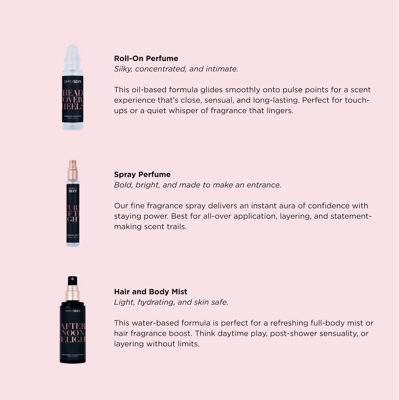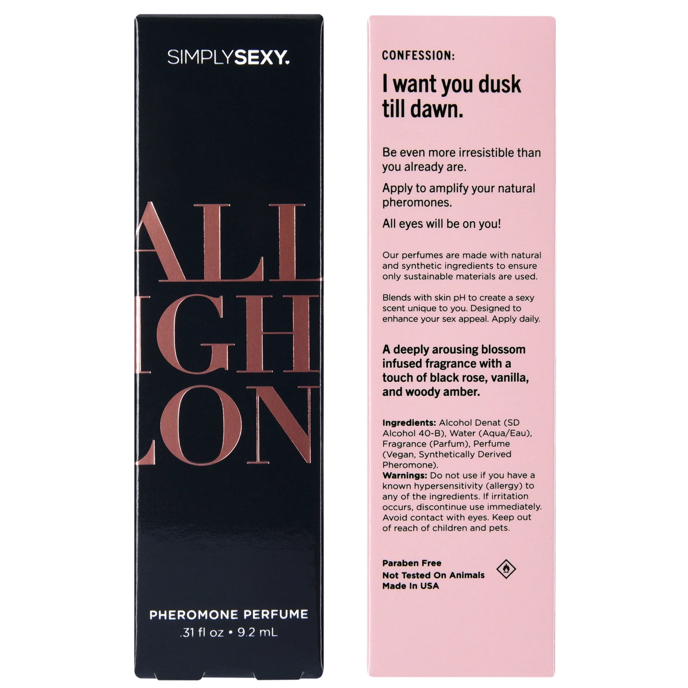 {"id":10184793784636,"title":"Simply Sexy All Night Long Pheromone Perfume Spray or Perfume Oil Roll or Fragrance Mist","handle":"simply-sexy-all-night-long-pheromone-perfume-spray-or-perfume-oil-roll-or-fragrance-mist","description":"\u003cp\u003e\u003cstrong\u003eLike the high that you never want to come down from.\u003c\/strong\u003e All Night Long is a full-body rush of pleasure and pure indulgence. It begins with a sparkling hit of orange, juicy raspberry, and lush peony that instantly awakens the senses. At the heart, exotic orchid, sweet lychee, and rich black rose unfold like a slow, seductive rhythm—intoxicating and impossible to forget. It melts into a decadent base of warm amber, silky caramel, creamy vanilla, and a touch of smoky woods, leaving a golden trail that lingers long after the lights come back on.\u003c\/p\u003e\n\u003cp\u003e\u003cstrong\u003eConfession:\u003c\/strong\u003e I want you dusk till dawn. A deeply arousing blossom infused fragrance with a touch of black rose, vanilla, and woody amber.\u003c\/p\u003e\n\u003cp\u003e\u003cstrong\u003eFRAGRANCE FAMILY:\u003c\/strong\u003e Amber Floral Gourmand | \u003cstrong\u003eVIBE:\u003c\/strong\u003e Euphoric * Addictive * After-Hours\u003c\/p\u003e\n\u003cp\u003e\u003cstrong\u003ePerfume Spray Features:\u003c\/strong\u003e\u003c\/p\u003e\n\u003cul\u003e\n\u003cli\u003eBest for all-over application, layering, and statement-making scent trails.\u003cbr\u003e\n\u003c\/li\u003e\n\u003cli\u003eBlends with skin pH to create a one-of-a-kind scent.\u003cbr\u003e\n\u003c\/li\u003e\n\u003cli\u003eMay enhance your natural pheromone production and increase sex appeal.\u003cbr\u003e\n\u003c\/li\u003e\n\u003cli\u003eParaben Free, Vegan, and not tested on animals.\u003cbr\u003e\n\u003c\/li\u003e\n\u003cli\u003eDirections: Hold 5-7 inches away from skin and apply to pulse points.\u003c\/li\u003e\n\u003c\/ul\u003e\n\u003cp\u003e\u003cstrong\u003ePerfume Oil Roll On Features:\u003c\/strong\u003e\u003c\/p\u003e\n\u003cul\u003e\n\u003cli\u003eOil formula allows for long-lasting, concentrated application on pulse points.\u003cbr\u003e\n\u003c\/li\u003e\n\u003cli\u003eBlends with skin pH to create a one-of-a-kind scent.\u003cbr\u003e\n\u003c\/li\u003e\n\u003cli\u003eFeatures a nourishing blend of Soybean, Safflower, and Grape Seed Oils with Vitamin E.\u003cbr\u003e\n\u003c\/li\u003e\n\u003cli\u003eMay be used alone, but is great when layered with Simply Sexy perfume and body mist.\u003c\/li\u003e\n\u003c\/ul\u003e\n\u003cp\u003e\u003cstrong\u003eFragrance Body Mist Features:\u003c\/strong\u003e\u003c\/p\u003e\n\u003cul\u003e\n\u003cli\u003eLight, lavish spray formula perfect for layering and full-body coverage.\u003cbr\u003e\n\u003c\/li\u003e\n\u003cli\u003eBlends with skin pH to create a one-of-a-kind scent.\u003cbr\u003e\n\u003c\/li\u003e\n\u003cli\u003eParaben and Mineral Free.\u003cbr\u003e\n\u003c\/li\u003e\n\u003cli\u003eMay enhance your natural pheromone production and increase sex appeal.\u003cbr\u003e\n\u003c\/li\u003e\n\u003cli\u003eDirections: Lavishly spray on skin anytime you want a refreshing boost of fragrance.\u003c\/li\u003e\n\u003c\/ul\u003e\n\u003cp\u003e\u003cstrong\u003eProduct Details:\u003c\/strong\u003e\u003c\/p\u003e\n\u003cul\u003e\n\u003cli\u003eTOP NOTES: Orange, Raspberry, Peony\u003cbr\u003e\n\u003c\/li\u003e\n\u003cli\u003eMID NOTES: Tropical Orchid, Lychee, Black Rose\u003cbr\u003e\n\u003c\/li\u003e\n\u003cli\u003eBASE NOTES: Sweet Amber, Caramel, Vanilla, Woody Amber\u003c\/li\u003e\n\u003cli\u003e\n\u003cstrong\u003ePerfume Spray:\u003c\/strong\u003e\u003cbr\u003e\n\u003cul\u003e\n\u003cli\u003eVolume: 9.2mL (0.31 fl oz)\u003cbr\u003e\n\u003c\/li\u003e\n\u003cli\u003eIngredients: Alcohol Denat (SD Alcohol 40-B), Water (Aqua\/Eau), Fragrance (Parfum), Perfume (Vegan, Synthetically Derived Pheromone).\u003c\/li\u003e\n\u003c\/ul\u003e\n\u003c\/li\u003e\n\u003cli\u003e\n\u003cstrong\u003ePerfume Oil Roll On:\u003c\/strong\u003e\u003cbr\u003e\n\u003cul\u003e\n\u003cli\u003eVolume: 10.2mL (0.34 fl oz)\u003cbr\u003e\n\u003c\/li\u003e\n\u003cli\u003eIngredients: Glycine Soja (Soybean) Oil, Isopropyl Palmitate, Fragrance (Parfum), Caprylic\/Capric Triglyceride, Carthamus Tinctorius (Safflower) Seed Oil, Vitis Vinifera (Grape) Seed Oil, Tocopheryl Acetate (Vitamin E), Perfume (Vegan, Synthetically Derived Pheromone).\u003c\/li\u003e\n\u003c\/ul\u003e\n\u003c\/li\u003e\n\u003cli\u003e\n\u003cstrong\u003eFragrance Body Mist:\u003c\/strong\u003e\u003cbr\u003e\n\u003cul\u003e\n\u003cli\u003eVolume: 99ml (3.3fl oz)\u003cbr\u003e\n\u003c\/li\u003e\n\u003cli\u003eIngredients: Water (Aqua\/Eau), Fragrance (Parfum), Perfume (Vegan, Synthetically Derived Pheromone), Polysorbate 20, Citric Acid, Potassium Sorbate, Sodium Benzoate.\u003c\/li\u003e\n\u003c\/ul\u003e\n\u003c\/li\u003e\n\u003c\/ul\u003e\n\u003cp\u003e\u003cstrong\u003ePackage Details:\u003c\/strong\u003e\u003c\/p\u003e\n\u003cul\u003e\n\u003cli\u003e\n\u003cstrong\u003ePerfume Spray:\u003c\/strong\u003e\u003cbr\u003e\n\u003cul\u003e\n\u003cli\u003eWeight: 71g (2.5oz)\u003cbr\u003e\n\u003c\/li\u003e\n\u003cli\u003eHeight: 135mm (5.3\")\u003cbr\u003e\n\u003c\/li\u003e\n\u003cli\u003eLength: 39mm (1.5\")\u003cbr\u003e\n\u003c\/li\u003e\n\u003cli\u003eWidth: 39mm (1.5\")\u003cbr\u003e\n\u003c\/li\u003e\n\u003c\/ul\u003e\n\u003c\/li\u003e\n\u003cli\u003e\n\u003cstrong\u003ePerfume Oil Roll On:\u003c\/strong\u003e\u003cbr\u003e\n\u003cul\u003e\n\u003cli\u003eWeight: 44g (1.6oz)\u003cbr\u003e\n\u003c\/li\u003e\n\u003cli\u003eHeight: 90mm (3.5\")\u003cbr\u003e\n\u003c\/li\u003e\n\u003cli\u003eLength: 22mm (0.9\")\u003cbr\u003e\n\u003c\/li\u003e\n\u003cli\u003eWidth: 22mm (0.9\")\u003cbr\u003e\n\u003c\/li\u003e\n\u003c\/ul\u003e\n\u003c\/li\u003e\n\u003cli\u003e\n\u003cstrong\u003eFragrance Body Mist:\u003c\/strong\u003e\u003cbr\u003e\n\u003cul\u003e\n\u003cli\u003eWeight: 136g (4.8oz)\u003cbr\u003e\n\u003c\/li\u003e\n\u003cli\u003eHeight: 162mm (6.4\")\u003cbr\u003e\n\
