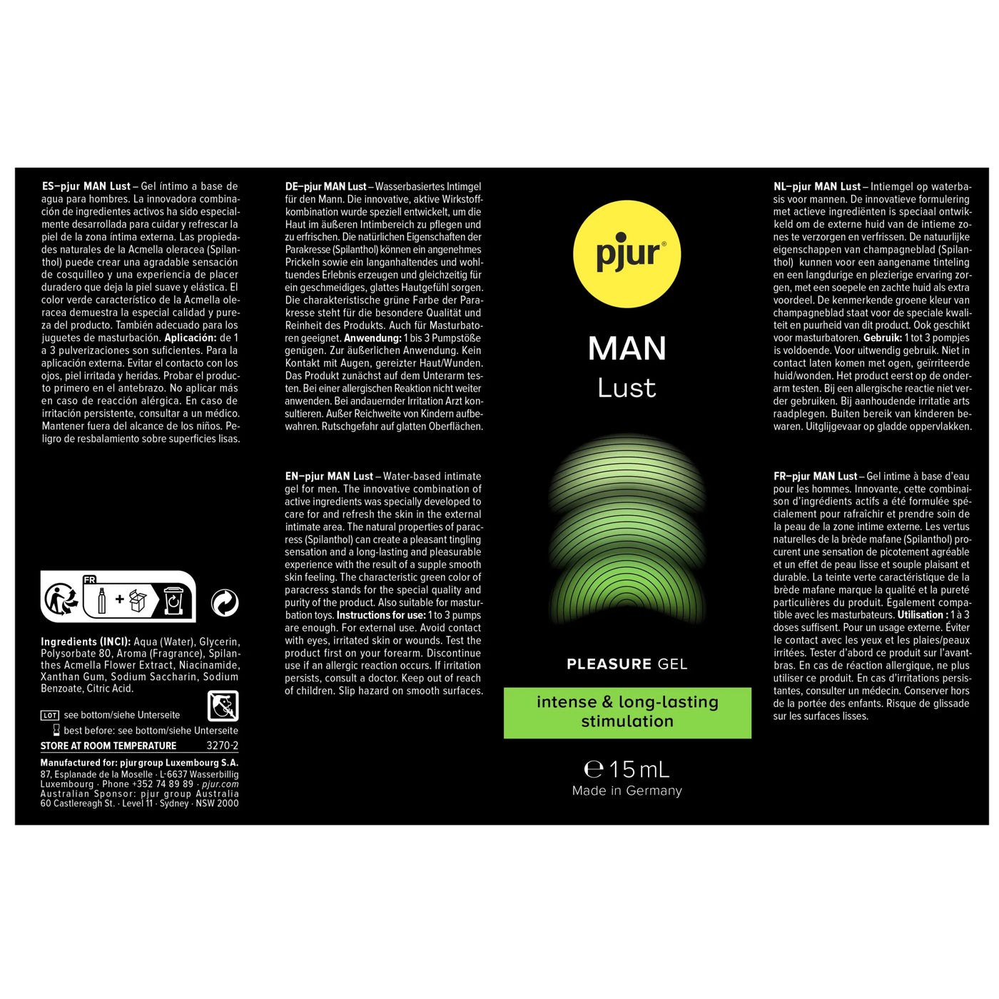 pjur MAN Lust is an invitation to redefine pleasure. The innovative formula with natural Spilanthol takes effect within seconds, creating an intense, tingling sensation that lasts up to 15 minutes. At the same time, the gel nourishes and refreshes the skin in the external intimate area, leaving it smooth and soft to the touch.