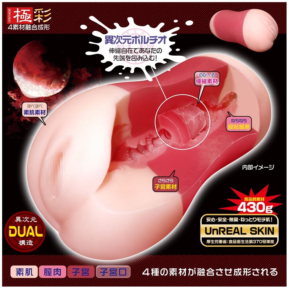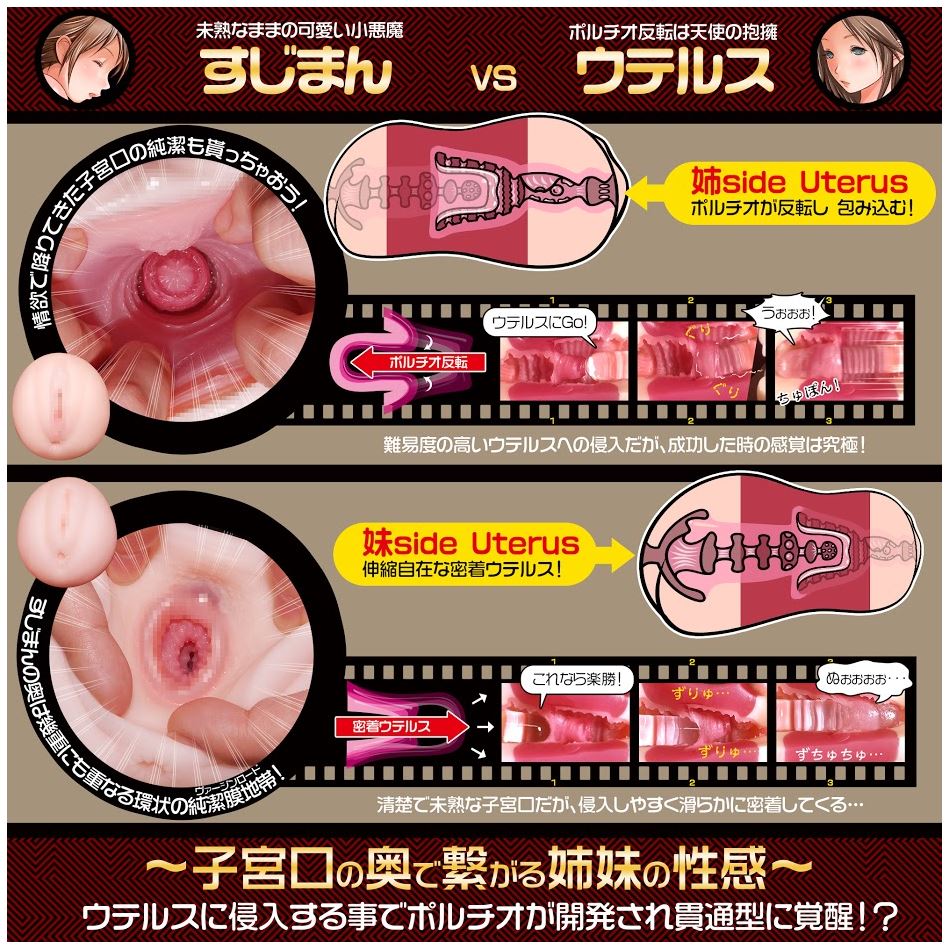 Both passages offer different sensations. The "older sister" Uterus tunnel has a softer, more comfortable texture while the "younger sister" Sujiman end features a harder texture for a more intense ride. Both tunnels has a "cervix" at its end to make your thrusts feel even more realistic.